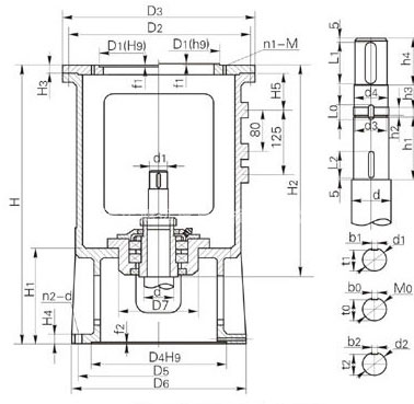 | 減速機(jī)輸出軸徑d0 | 減速機(jī)類別代號 | D1 | D2 | D3 | n1-M | f1 |